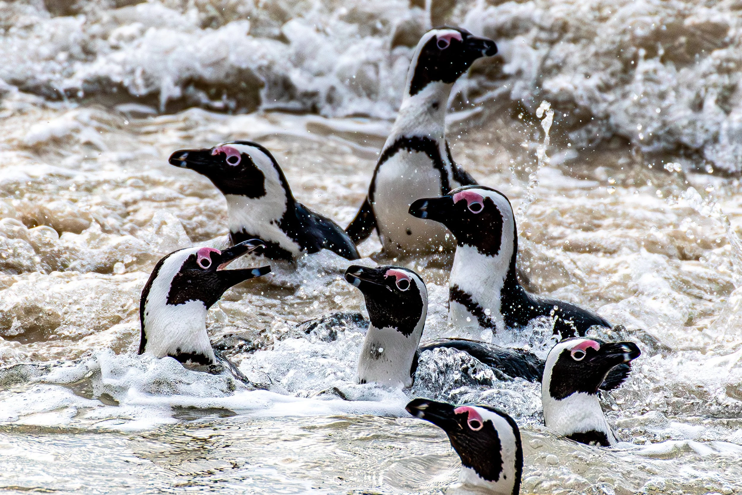 We arrived back at the beach but unfortunately there were no penguins in the water. No sense in getting wet and cold for nothing. Ah well, another good reason to come back. We scrambled through the cave and out into a maze of alleys between tall boulders. At the end of an open area, a family was watching a group of penguins as they marched along the beach. I did a quick survey of the scene and anticipated that they would round a boulder into a narrow alley. My best photos would not come from following the group, my best photos would come from heading them off and catching their faces as they rounded the corner.