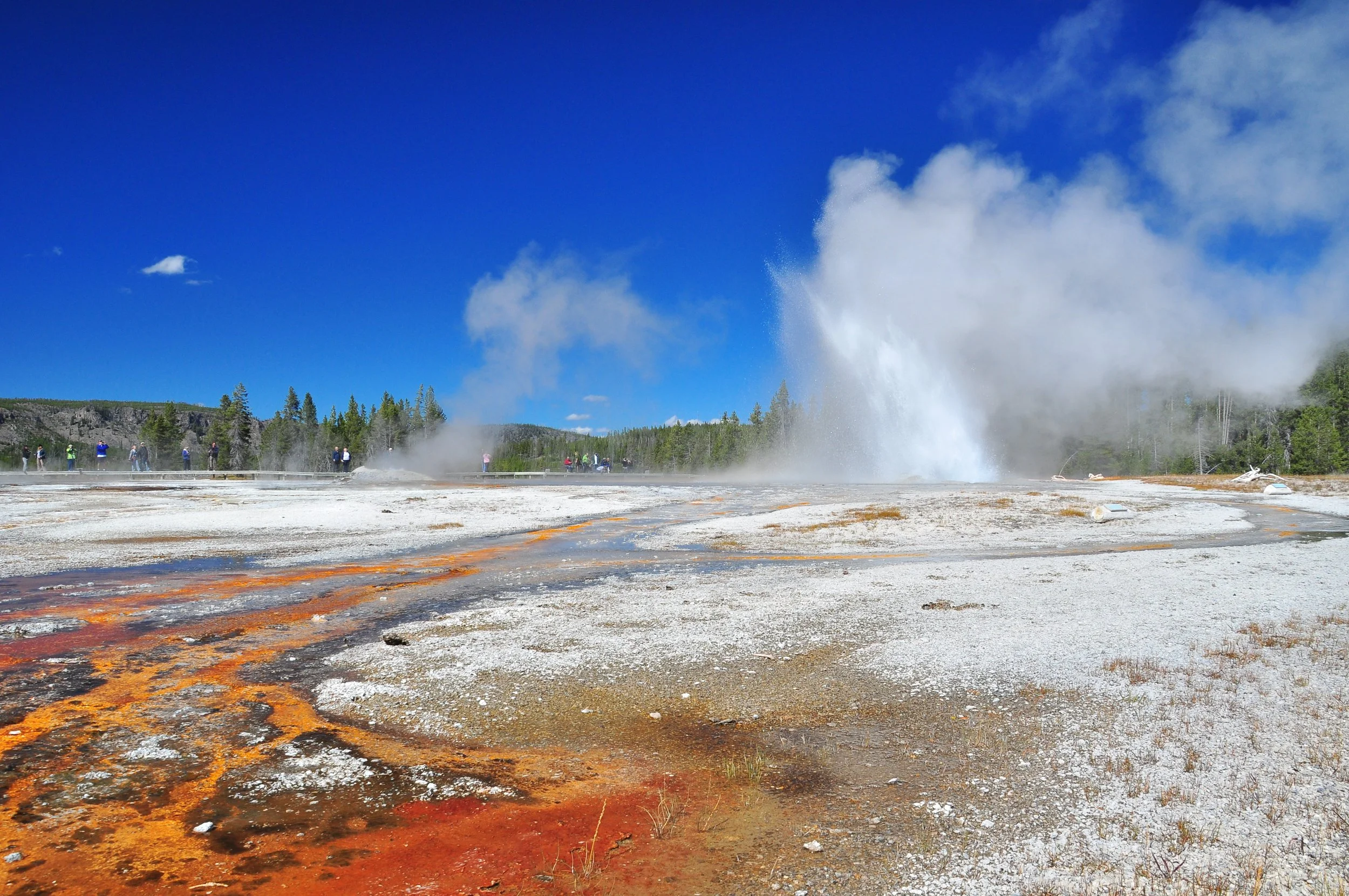 I’ve spent a fair amount of time in Yellowstone’s geothermal areas. It’s a landscape of low-rolling hills, mountains, small copses of trees interrupted by areas of bare white ground stained rusty-red. The gray rain gave way to blue skies and white clouds. The cool air temperature, the sound of the geyser erupting, and the familiar landscape took me back to my first time in Yellowstone fifteen years earlier. If you had blindfolded me and put me there at Strokkur I would have mistaken it for Norris or the Upper Geyser Basin.