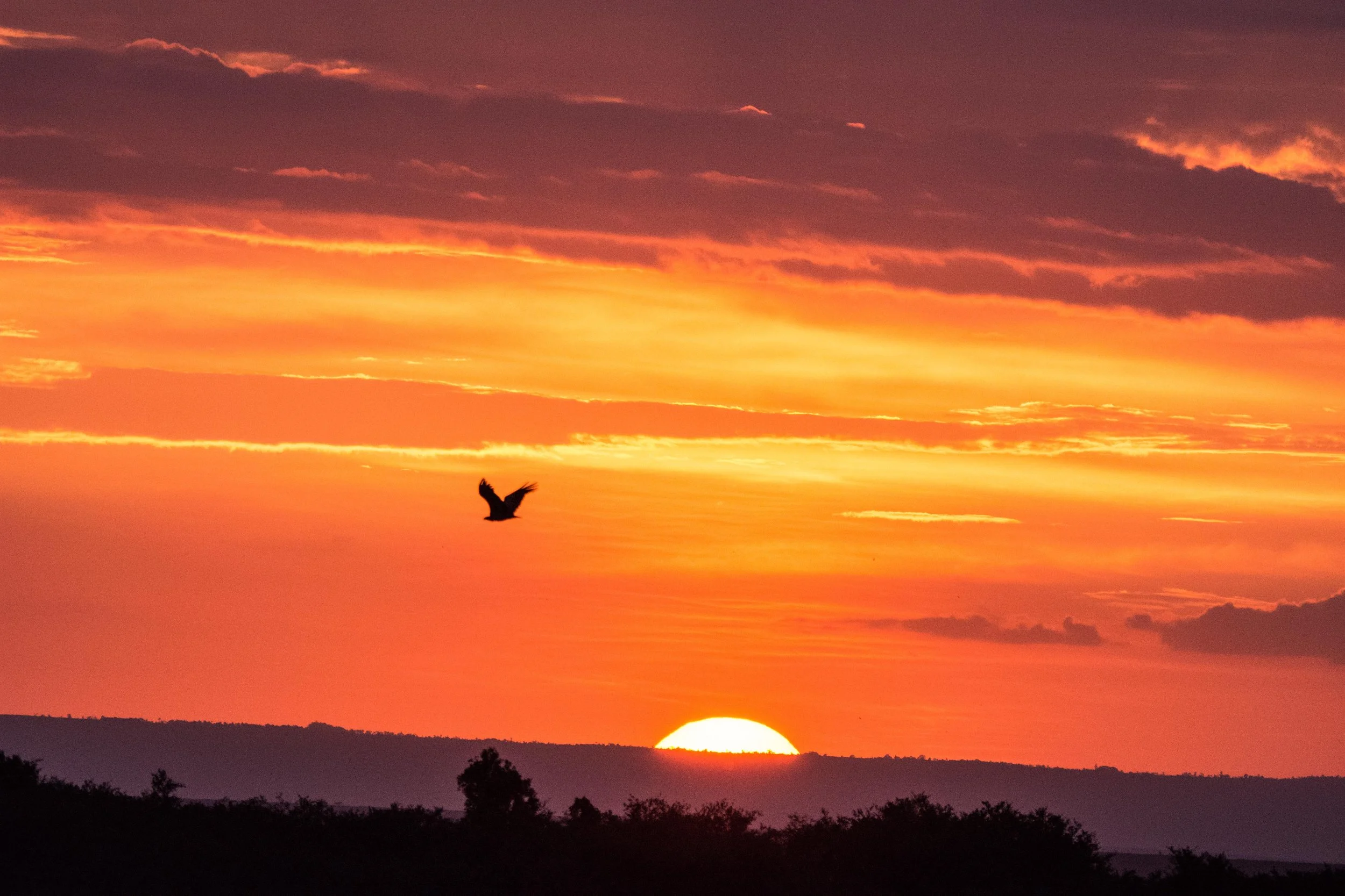The sunset started. At first, light pastel colors filled in the bottoms of the clouds, but as the sun neared the horizon it lit up like the opening of the Lion King. This was a fitting last sunset on the Mara.