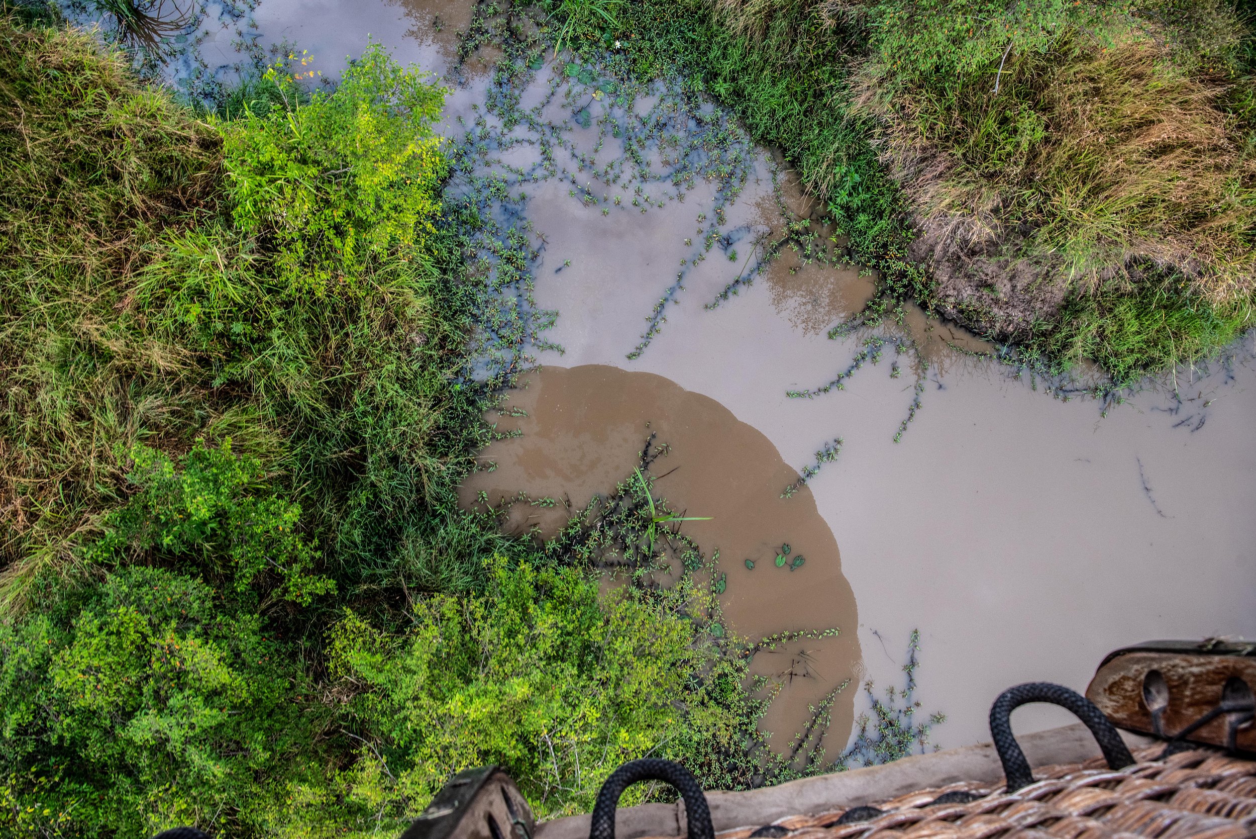Elephants grazed among the bushes at this early hour and we began to descend. We got within six feet of the ground, brushing the grass. David pulled us up and over some trees just in time to avoid a collision. We were eye level with lilac-breasted rollers and coucals. We flew over jacanas and hammerkopps quietly enjoying breakfast in the intermittent water pools of the lugga. Once in a while, David would pull some ropes, changing the shape of the balloon, and thereby our course and the basket direction.