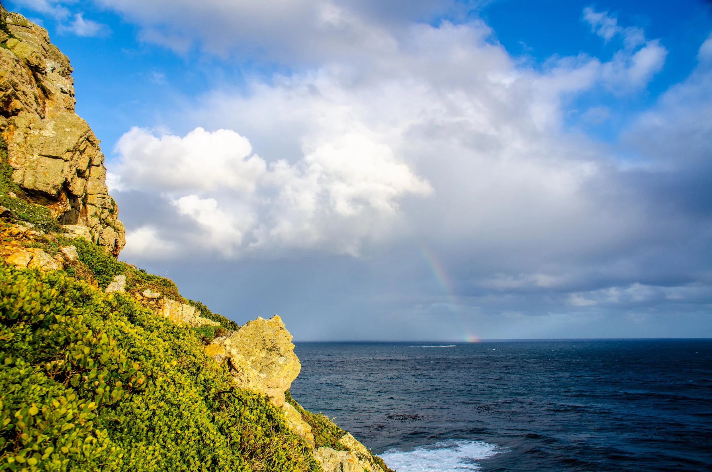 A small trail leads up the hill and onto the escarpment. Intrepid in our desire for better views, we followed up the path which was made from logs and stone. There were a fair number of tourists from all provenance here. A Rhabdomys mouse scurried past at our feet. At the top of the cliff, we took in an absolutely breathtaking panorama. After a few photos, I remembered our mantra: put the camera down and just enjoy the view. To the east, the other end of the Cape and the lighthouses. To the north, green and yellow hills with a winding trail through them, another pair of ostrich pecking their way across the verdant hillside. To the west, crepuscular rays were breaking through clouds, reflecting bright off the ocean front. And to the south, we were treated with a gorgeous rainbow and the threat of another band of rain.