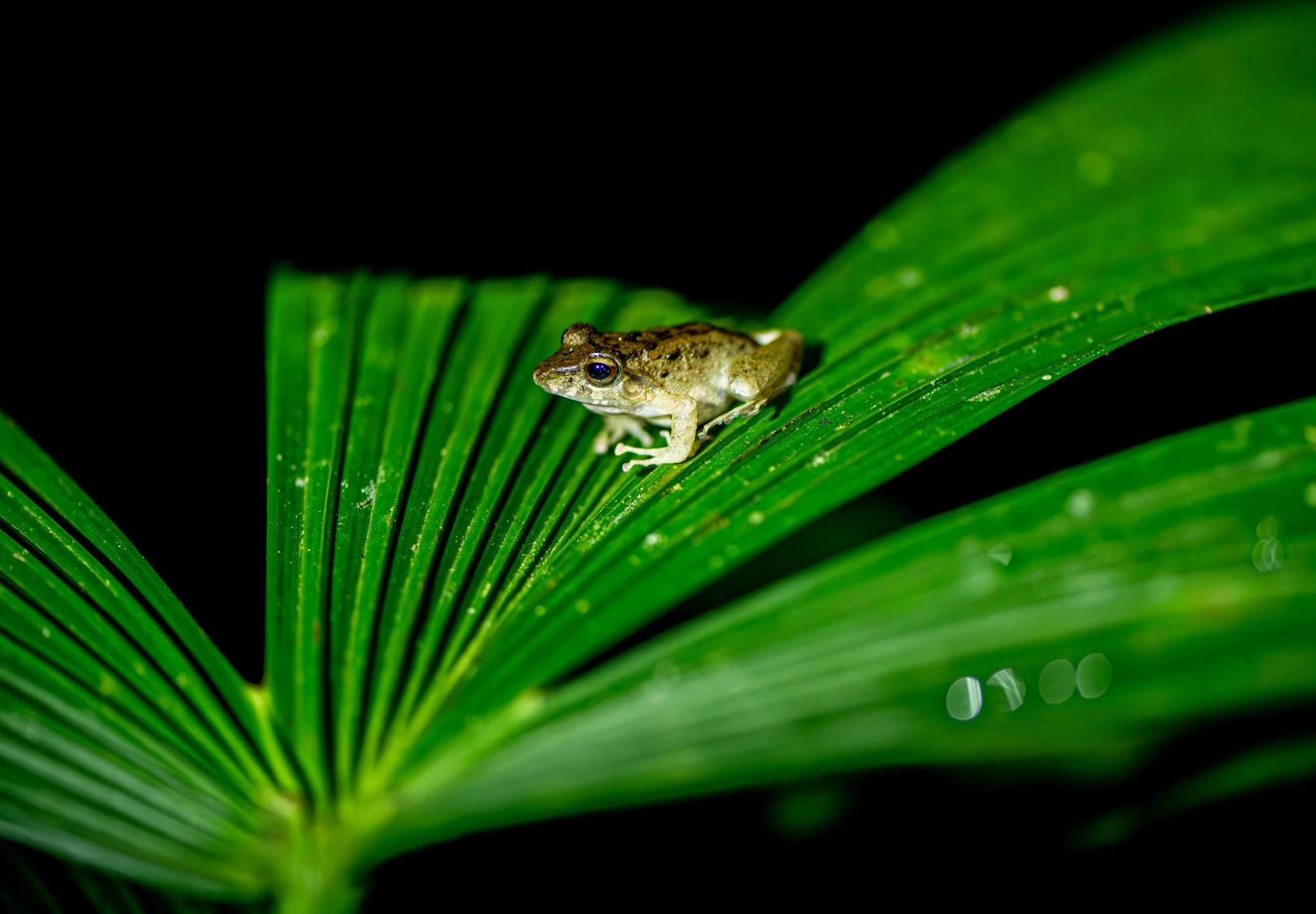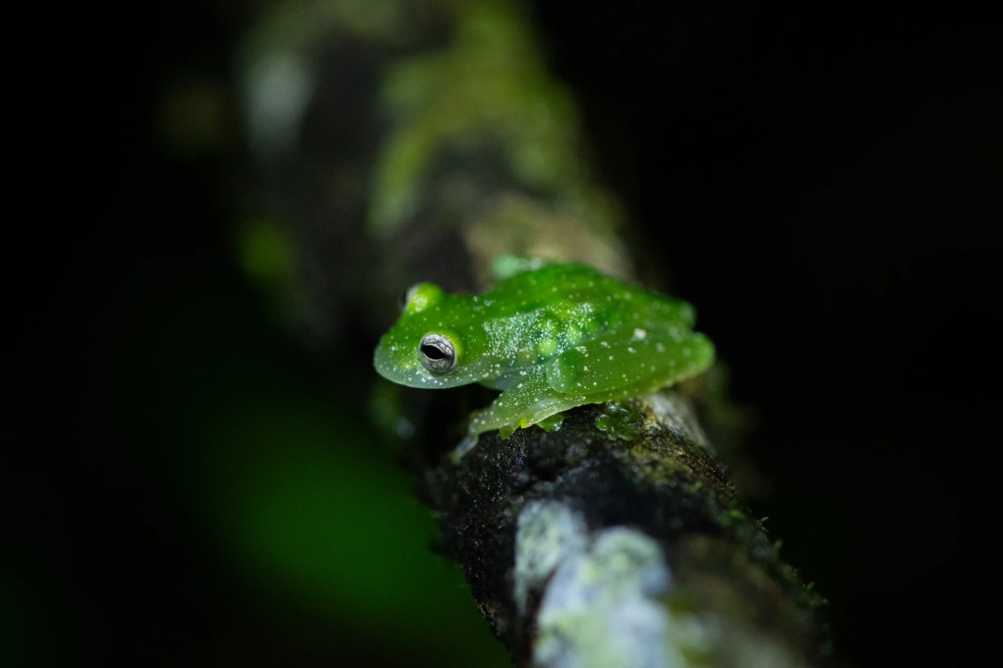 A little further up Royer could hear glass frogs in the ravine below. He disappeared down the muddy bank and into the dark. He called up that he found the frogs and they had eggs! I made my way down. I slipped towards the bottom and slid a short distance. I ended up with my foot stuck behind me. Royer came to take the camera so I could extract myself from the mud. He led me to some leaves overhanging the stream and lifted them. And there was a glass frog and a clutch of eggs. What a find! There was something about it that hit me deep down. As I stood in a small stream in the immense vastness of the jungle here was this tiny frog no bigger than one digit of my thumb. Protecting its eggs, eating, living and just existing. It's moments like these that bring the world into perspective. It becomes clear that as a human our impact can be huge on such a small creature. I took a few pictures, thanked Royer for finding them, I thanked the frogs for existing and quietly moved on and let them be. The night wore on and the trail looped back around through the land. We climbed a steep muddy hill with some difficulty and moved into an area that was once an old cacao farm. Old cacao trees lined the trail overgrown and unkempt, the jungle had reclaimed them as their own. The night ended and we went back to get some sleep.