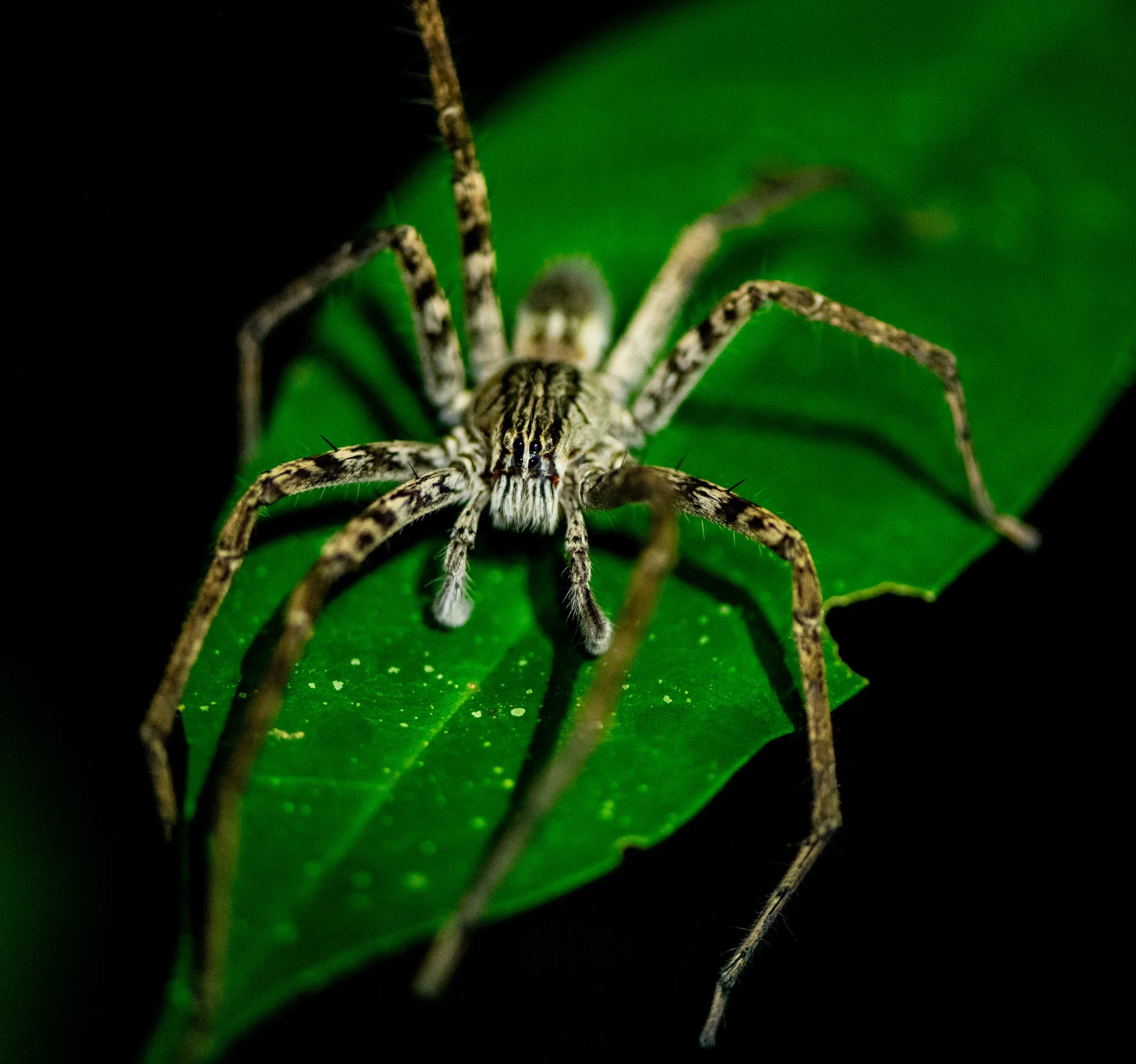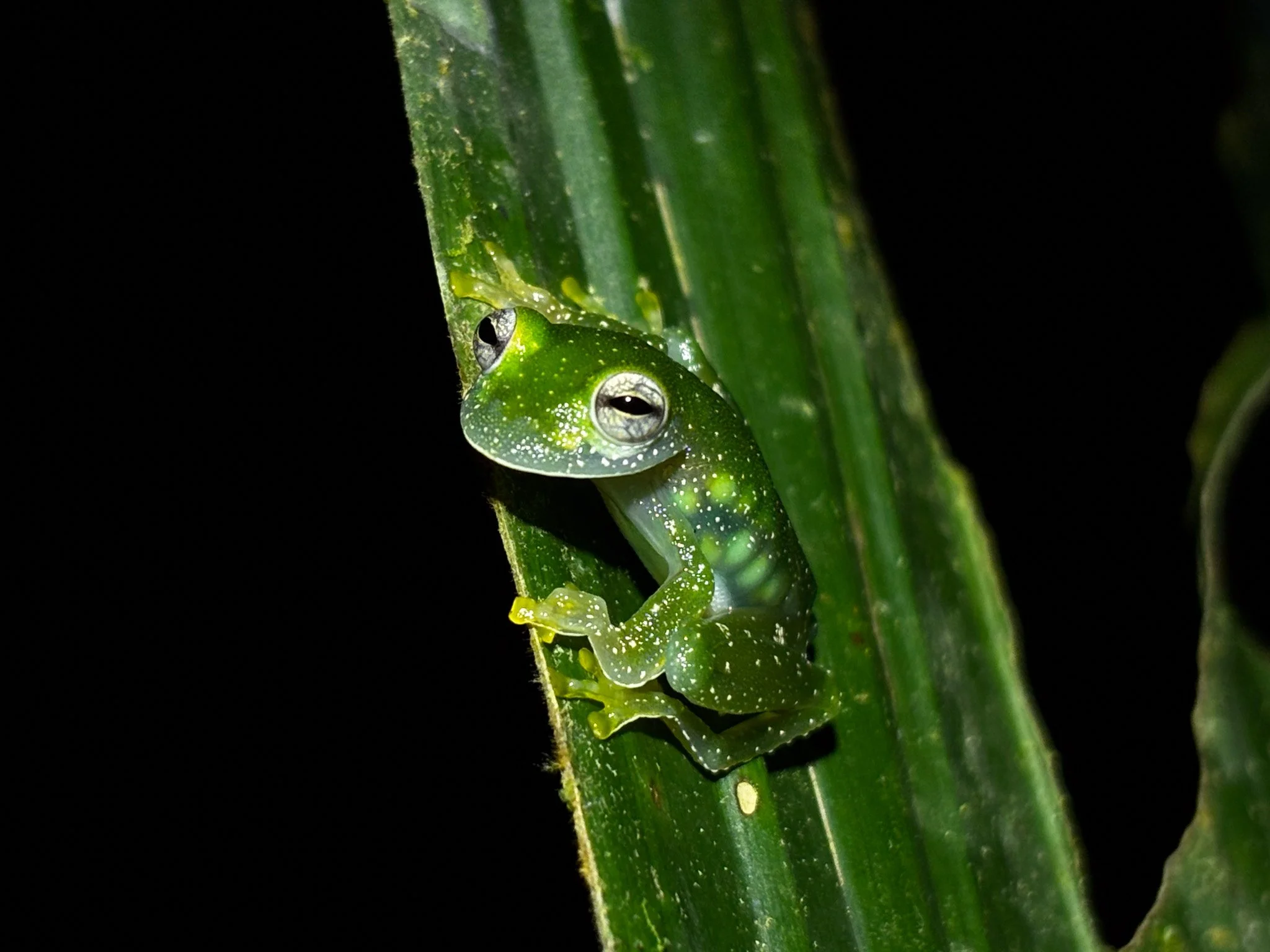 Let me stop for a moment to re-explain our guide Royer. The jungle is a loud place in the dark. Hundreds, if not thousands, of species of bugs and amphibians and who knows what else is making noise. Royer can distinguish all the noise and tell you what is what. When he hears something good he quickly darts away off the path and into the dark to find his quarry, usually not much bigger than a quarter up to a half dollar. Sometimes he can see them from the path at distances up to 30ft away, in the dark. So when I say “we” listen for frogs I really mean we wait for Royer to show it to us. We stopped a number of times to look for glass frogs, tarantulas, and snakes. We found one really cool blunt-headed tree snake and a few glass frogs.