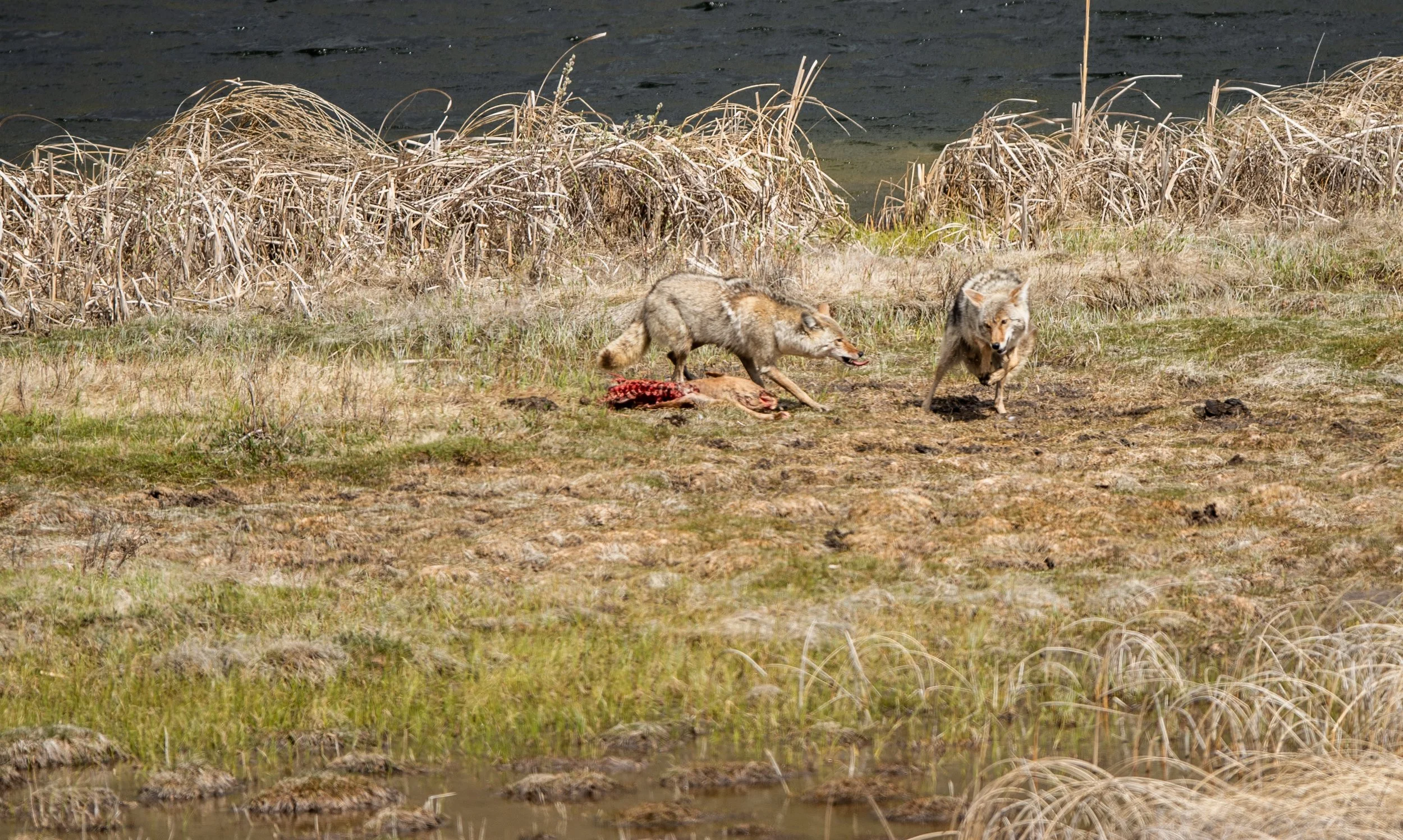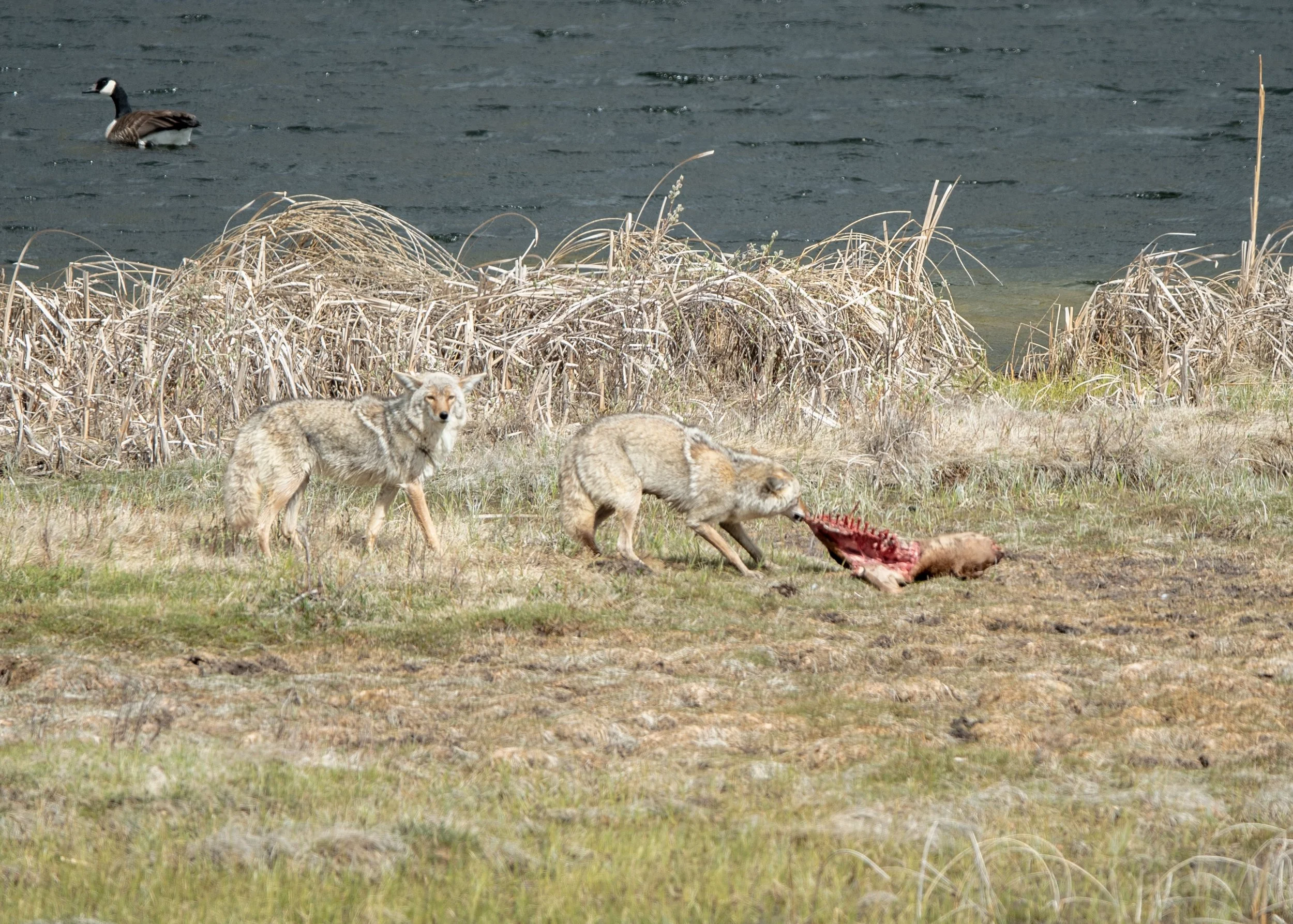 Coyotes are one of the most adaptable mammals in the US. They are found coast to coast in any environment including big cities like LA and NYC. Coyotes can/will eat most anything preferring small mammals like mice and voles but will eat carrion and plants as well. Coyotes can be seen moving through the sage brush hunting sometimes in pairs or even small packs. We got to see a den near the tower junction ranger station. A pair fought over a red dog carcass and even a pack of three fed off of a fresh bison carcass near junction butte.